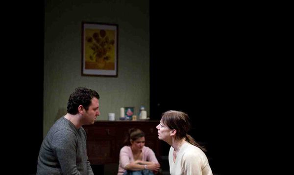 9. A young woman in a white shirt and striped skirt sits on the ground, facing the camera. She is looking towards a male actor in a white shirt who has his back to the camera.