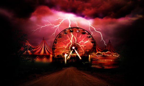 10. A young man stands looking upwards. He is bathed in a blue light. Behind him against a black backdrop, an circular yellow light is illuminated.