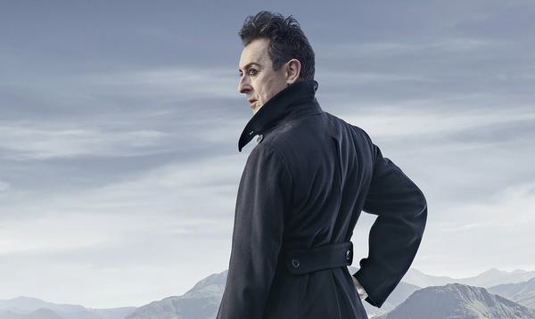 An actor in a mourning dress speaks into a microphone against a red curtain backdrop