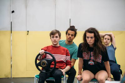 Front to back, left to right: Kyle Gardiner, Anna Russell Martin, Lawrence H Mullings and Louise McMenemy (cast) in rehearsal for The Panopticon, 2019.