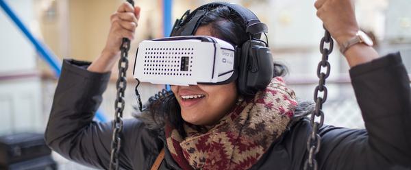 In VR Playground, riders are propelled through a series of colourful geometric virtual worlds, each driven by the action of swinging within a cubic structure. Moments of wonder, awe and trepidation elicit unexpected emotions, which are inadvertently performed to onlookers, many of whom are queuing for the ride themselves, curious to discover the secrets of these hidden worlds.